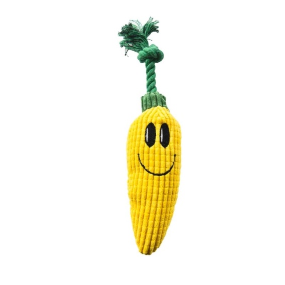 Pluszowa zabawka w kształcie kolby kukurydzy z miłego w dotyku materiału. Liście kukurydzy wykonane są z bawełnianego sznura z węzłem. Zabawka posiada piszczałkę. Odpowiednia dla małych i średnich psów.